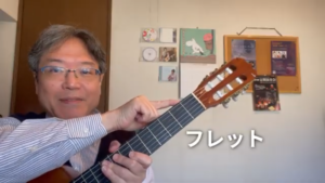 そして、この金属の棒がフレット。こちら側から1フレット、2フレットと数えます。クラシックギターの場合はボディとネックの接合部分は12フレットになっています。